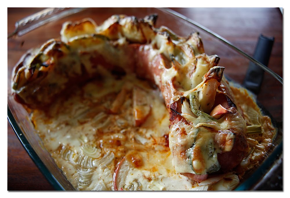 Som ni kanske minns har jag ett husmanskost-uppdrag som påbörjades efter februari. I dag kom del 4 (?) i denna serie. Jag gjorde en rätt vi äter då och då, ugnsbakad falukorv. För att pröva lite nya smaker med den hederliga falukorven så späckade jag den inte bara med lök och äpple utan även med saltgurka och tabascodroppar. Över allt hällde jag sedan grädde och ost. Riktigt mumsigt blev det, men det krävs nästan en utedag bakom sig för att det inte ska bli för mäktigt...